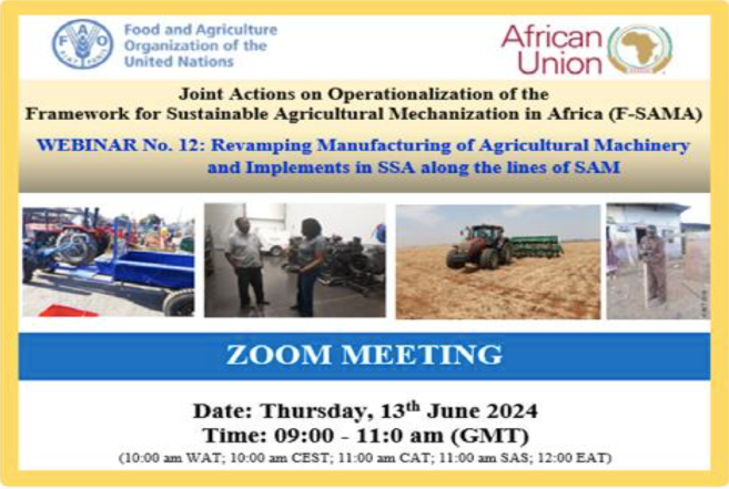 WEBINAR No. 12 on Revamping Manufacturing of Agricultural Machinery and Implements in Africa along the lines of SAM is schedule to take place on 13th June, 2024. This is part of the joint actions on Operationalization of the Framework for Sustainable Agricultural Mechanization in Africa (F-SAMA).